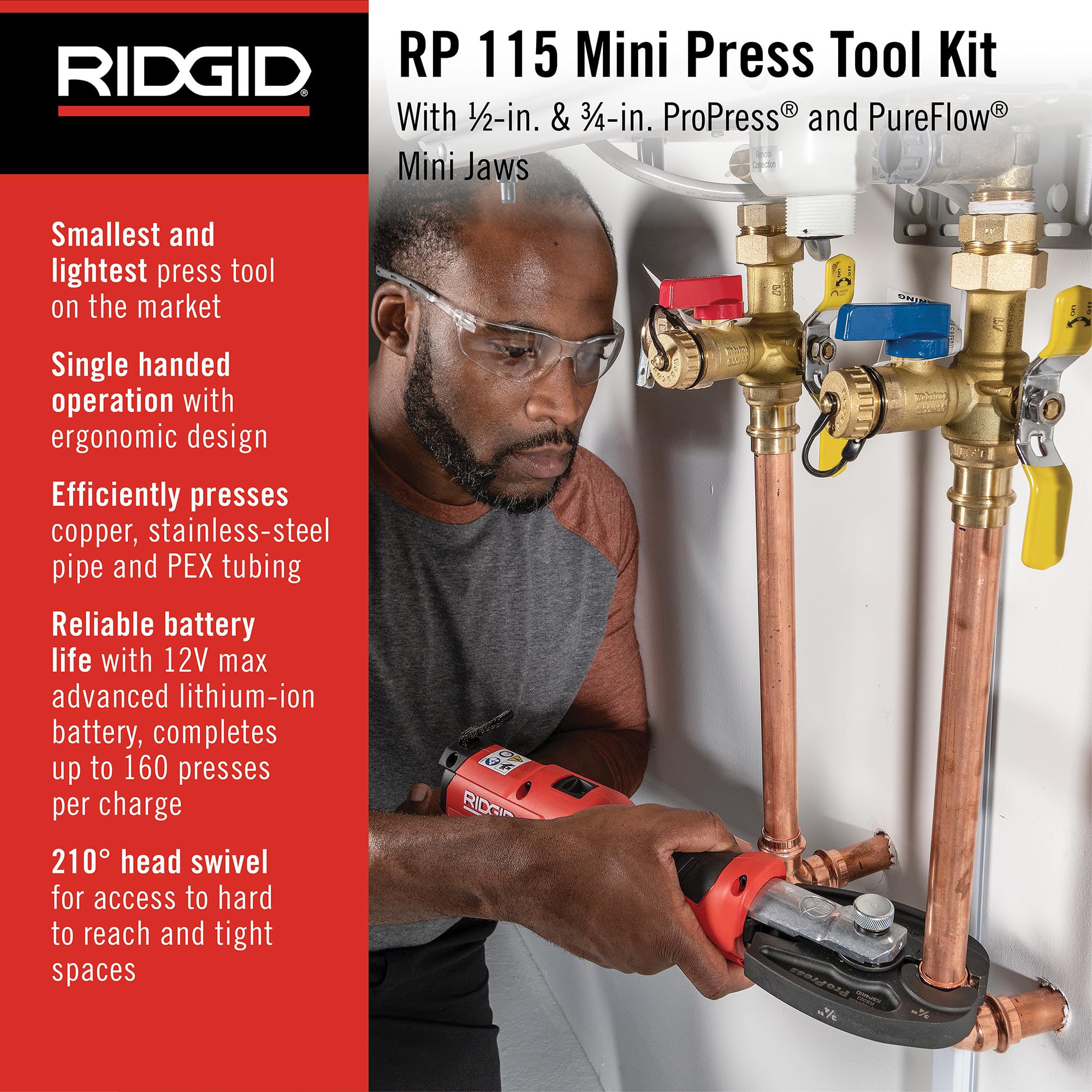 RIDGID 72558 Model RP 115 Mini Press Tool and Battery Kit with 1/2" to 3/4" ProPress and PureFlow Press Tool Jaws, 2V Li/Ion Battery, 12V Charger, and Carrying Case
